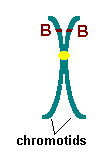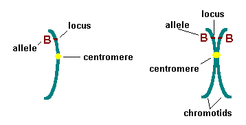 A single (before replication) or double (after replication) strand of DNA with only a single centromere. Chromosomes contain the loci for alleles of different genes. The illustration below shows a chromosome with the parts labeled before (on the left) and after (on the right) replication.